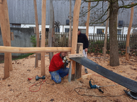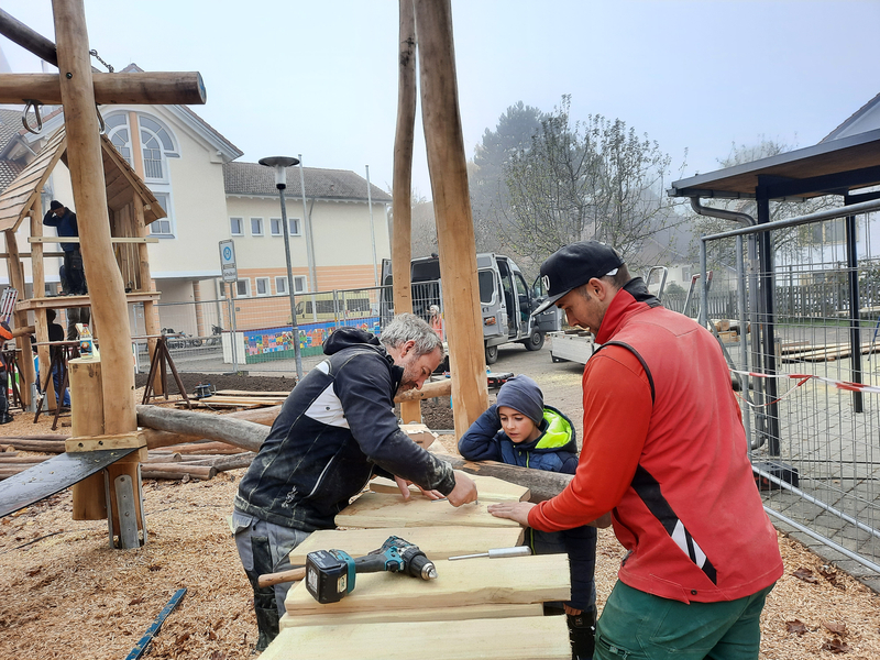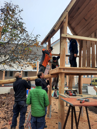 Am vergangenen Wochenende bewegte sich auf unserem Pausenhof so einiges: Die schon vorbereiteten Löcher für den neuen Spielplatz wurden durch die Tatkraft einiger fleißiger Helfer bereits mit den Stützpfeilern bestückt, betoniert und aufgefüllt.