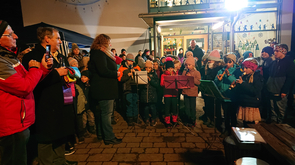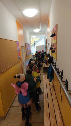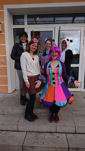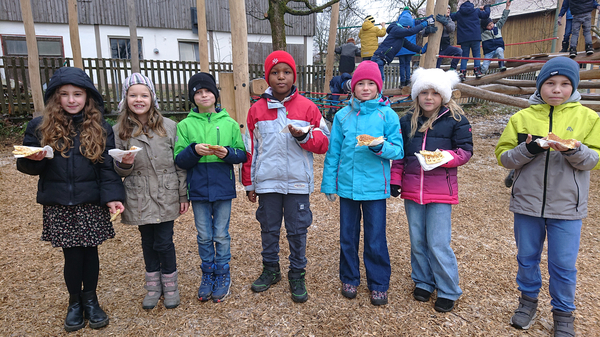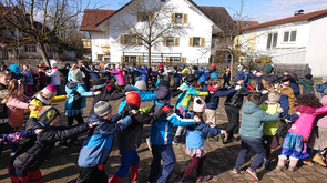 Nach dem Auftritt holte die 4. Klasse alle anderen Klassen mit einer Polonaise in den Zimmern ab und es ging gemeinsam auf den Pausenhof. Frau Lutz erfüllte diverse Liederwünsche und der Elternbeirat spendierte jedem Kind einen Krapfen.