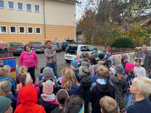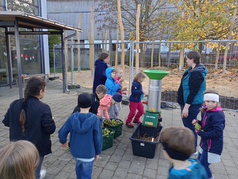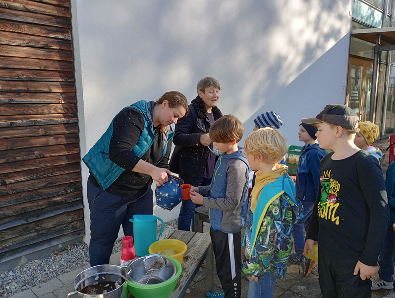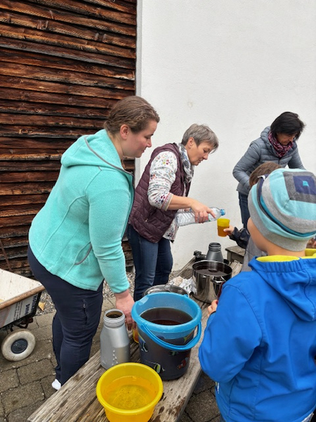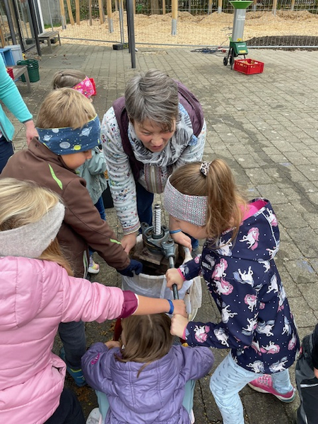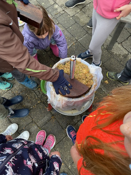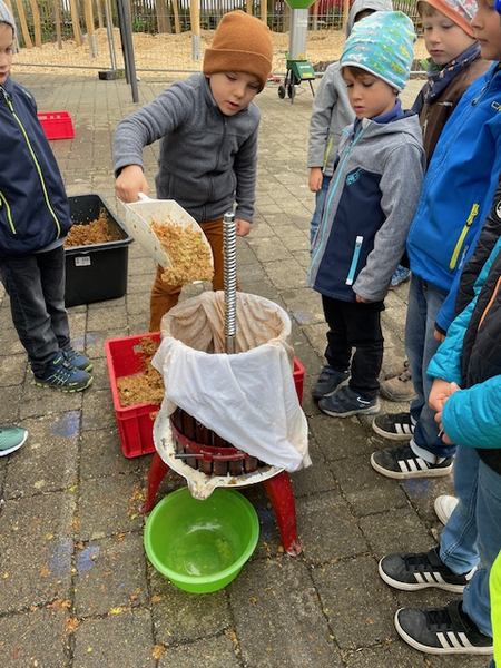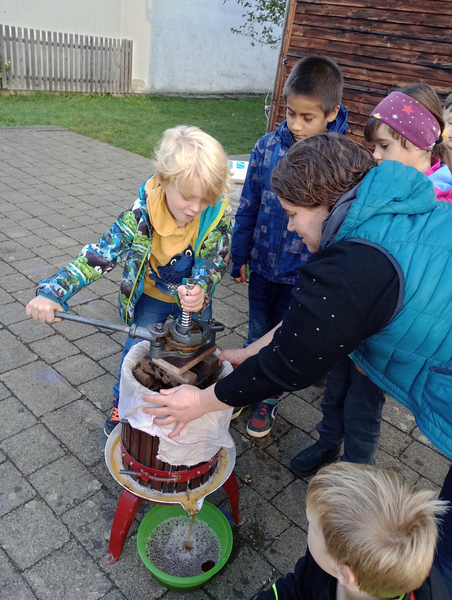 Frau Lautenbacher - Ranz kam am Dienstag, 15.10. und Donnerstag, den 17.10.2024 in Begleitung von Frau Sulzenbacher zu uns an die Schule, um mit den beiden ersten Klassen und mit den Zweitklässlern vor der großen Pause aus den Äpfeln der Schulhof - Bäume Saft zu pressen. Die Kinder und auch die Lehrerinnen merkten schnell, wie anstrengend das Pressen der Äpfel ist. Da war richtig Muskelkraft gefragt! Für die Süße gaben wir noch einige Birnen dazu. Der Saft war richtig lecker und schmeckte nach getaner Arbeit besonders gut.
