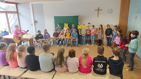 Am Freitag, 07.02. bekamen die beiden ersten Klassen ein musikalisches Vorspiel der Klasse 3b zu hören. Mit verschiedenen Orff-Instrumenten und in abwechselnder Besetzung begleiteten die SchülerInnen das Lied "Herr Winter, Herr Winter...". Die Kinder der 3b waren sich im Vorfeld einig, dass das Begleiten eines Stückes mit Instrumenten sehr viel Spaß macht.
