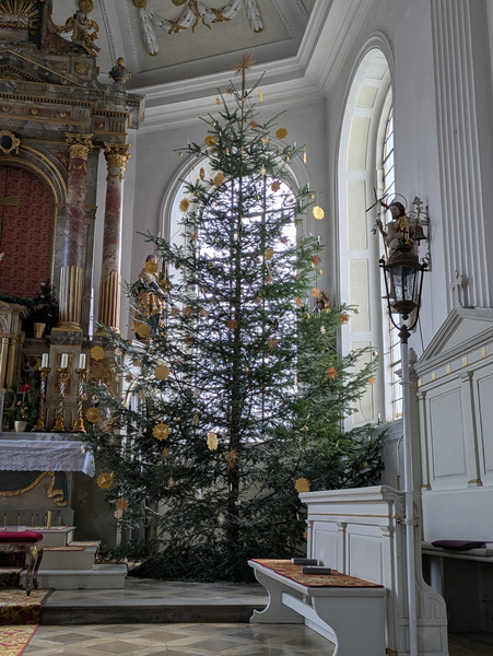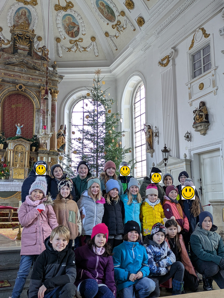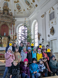 In diesem Jahr durften die Kinder der Grundschule die Weihnachtsdekoration der Kirche gestalten. In Absprache mit der Mesnerin entstanden so verschiedene Sterne, die mit den vorhandenen Strohsternen kombiniert wurden. Die 3. Klassen gestalteten Wickel-Sterne (rot) an den kleinen Bäumen. Die 4. Klasse übernahm die goldenen Sterne am großen Christbaum im Altarraum. In diesen versteckt sich innen jeweils ein Wunsch für Weihnachten (z. B. Weltfrieden, keine hungernden Kinder, o. ä.).