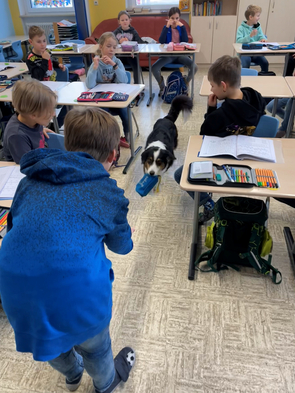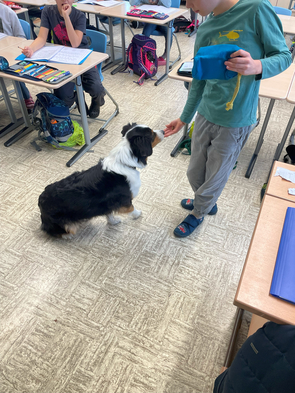Der Schulhund der 3a bringt fleißig die Kopfrechenaufgaben. Aber in dem Mäppchen sind nicht nur die Aufgaben, sondern natürlich auch kleine Belohnungen für den vierpfotigen Helfer.