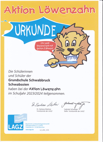 Jedes Jahr macht unsere Schule bei der Aktion "Löwenzahn" der Bayerischen Landesarbeitsgemeinschaft Zahngesundheit e.V. mit. Die Kinder sammeln in jeder Klasse fleißig ihre Zahnkarten, die sie am Anfang des Schuljahres bekommen. Für jede ausgefüllte Karte gibt es einen Sticker. Am Schuljahresende werden alle Karten zusammen eingeschickt. Für das letzte Schuljahr haben wir deshalb eine Zahnrettungsbox erhalten.