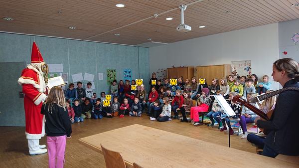 Auch in diesem Jahr besuchte uns am Freitag, 06.12. wieder der Heilige Nikolaus mit seinem Gehilfen, dem Knecht Ruprecht in der Schule. Besonders die Kinder der ersten Klassen waren gespannt, was er über sie zu berichten hatte. Aber auch die anderen Kinder hörten gut und aufmerksam zu. Zum Schluss bekam jede Klasse einen gut gefüllten Sack. Mit dem gemeinsamen Lied "Nikolaus, Nikolaus, pack die Taschen aus" wurden der Heilige und sein Helfer dann verabschiedet.