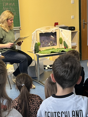 Am 30.10. besuchte Frau Leier die 1. Klasse mit dem Kamishibai. Sie führte die Geschichte “Das kleine Gespenst” vor und bezog die Kinder über Instrumente mit in die Geschichte ein. Am Ende gab es für jedes Kind einen Lutscher, der als “Gespenst” verkleidet war. Die Klasse war begeistert von der Geschichte und konnte auch am nächsten Tag noch viele Einzelheiten berichten.