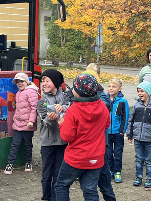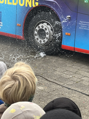 Am 15.10. kam Herr Kranz vom RVO und führte mit allen Klassen ein Bustraining durch. Das Anstehen, Einsteigen, die Gefahren und das richtige Verhalten bei Busfahrten war Thema der Schulung. Eindrücklich zeigte das Überfahren einer Plastikwasserflasche die Kraft des Fahrzeugs. Zuvor hatte es niemand geschafft, die Flasche mit den Händen zu zerbrechen.