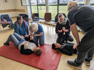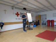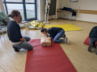 Am Buß- und Bettag trafen sich die Lehrerinnen und Frau Helmer-Storz von der Mittagsbetreuung zu einer Auffrischung des 1. Hilfekurses. Wir erfuhren viel Wissenswertes über die Aufgabe als Ersthelferinnen. Gegenseitig übten wir das Anlegen von Verbänden, und die stabile Seitenlage. Auch die lebenswichtige Herz-Lungen-Wiederbelebung übten wir an dafür bereitgestellten Puppen. Es war eine sehr informative und auch witzige Fortbildung!