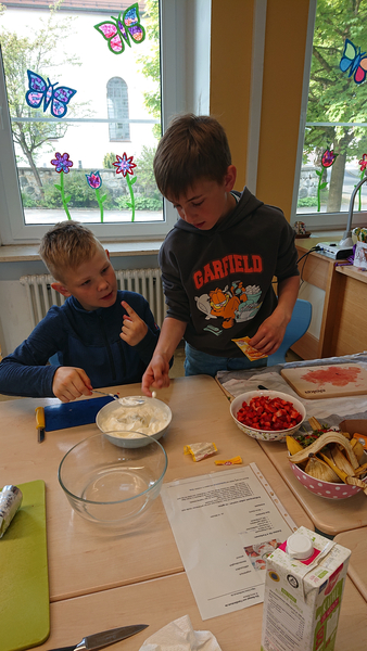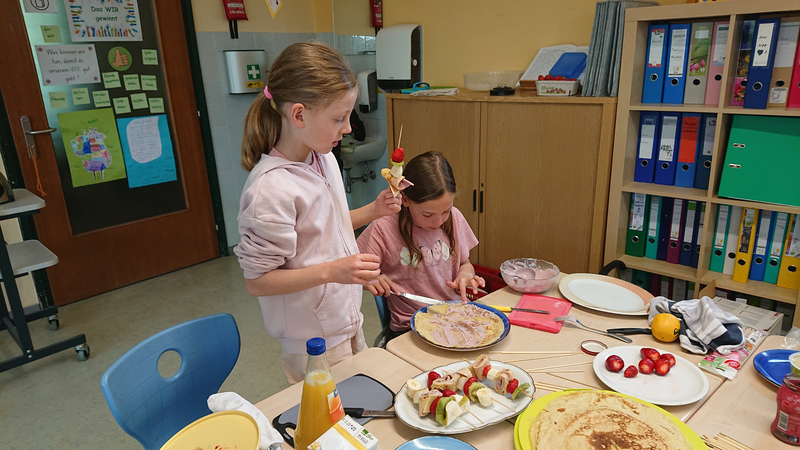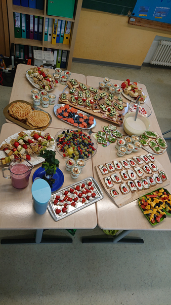 Die 3. Klasse machte am Freitag, 26.05.23 ein gesundes Frühstück. Mit viel Freude gingen die Kinder mit Hilfe von vier engagierten Mamas und ihrer Lehrerin Frau Fischer ans Werk. Verschiedene Rezepte wurden ausprobiert: von Birchermüsli und Monsterbroten über einen leckeren Himbeersmoothie war viel Leckeres dabei. Die SchülerInnen ließen es sich im Anschluss an ihrem selbst gemachten Buffet schmecken.