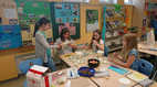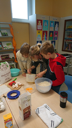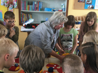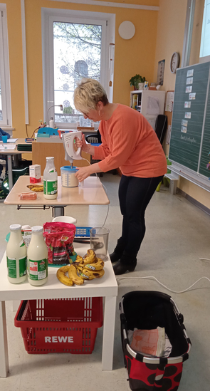 Im Rahmen des Deutschunterrichts beschäftigt sich die 3. Klasse mit dem Thema "Rezept". Zu Beginn der Unterrichtseinheit bereitet Frau Fischer unter den erwartungsvollen Augen der SchülerInnen Bananen- und Himbeermilch zu.