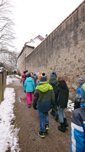 Auf dem Rückweg kamen wir am Ballenhaus vorbei, das damals als Waren- und Lagerhaus diente. Auf dem Polizeidienerturm durften dann alle mutigen Kinder "Hus us" aus dem Fenster in die Stadt rufen. Im Mittelalter schrie der Türmer seiner Zeit immer abends aus dem Fenster, um die Menschen ans Löschen ihres Herdfeuers zu erinnern. Zum Abschluss spazierten wir noch außen an der Stadtmauer entlang und gelangten durchs heutige Frauentor wieder in die Stadt.