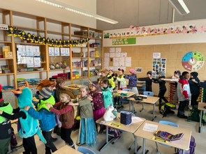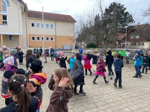 Am "Rußigen Freitag" , den 17.02.23, startete eine große Faschingssause in der Schule. Alle Klassen schlossen sich einer Polonaise durch die beiden Schulhäuser an. Auf dem Pausenhof wurde getanzt und gelacht. Der Elternbeirat spendierte uns Krapfen! Herzlichen Dank dafür!