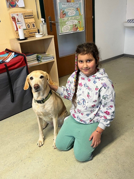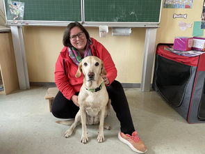 Bereits seit 2022 ist die Labradorhündin Dakota mit Frau Graser im Unterricht und trägt mit ihrer liebevollen und beruhigenden Art zu einer positiven Lernumgebung bei und unterstützt sowohl Schüler als auch Lehrer in ihrem Schulalltag. Dakota ist eine Labradorhündin aus der Arbeitslinie. Sie wurde 2018 geboren und kam mit acht Wochen in die Familie Graser. Dort wuchs sie mit einem Schäferhund und einem Kelpie auf. Ihre Prüfung zum Schulhund absolvierte sie 2022 mit Auszeichnung. Dakota ist ungeheuer belastbar, arbeitsfreudig und mit einem unendlichen "will to please" ausgestattet.